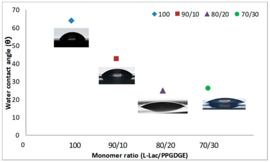 Finally, the wettability properties of the synthesized copolymers were evaluated using measures of contact angle. As seen in Figure 7, a decrease in contact angle measurements were exhibited in all the copolymers compared with neat PLA. An obvious hydrophilic improvement with the increasing constitution of the PPGDE in the copolymer is observed. It is known that the PPGDGE is a polymer with alternate hydrophobic and hydrophilic groups in molecular chains, but in this case the hydrophilic parts of the PPGDGE had a greater influence within the copolymer. The hydrophilicity modifications are confirmed by the rapid contact angle decreasing in the first 10 s, and it serves as an evidence for the copolymer hydrophilic improvement when PPGDGE is introduced. When 30% of this monomer was added, the contact angle decreased almost 38° in comparison with pristine PLA. As can be seen, the increases of PPGDGE in the monomer ratio decreases the contact angle, this is in accordance with what was previously described in the literature. Alli et.al., found a similar behavior [46], as they included more PPG inside the study copolymer, the contact angle was decreasing.