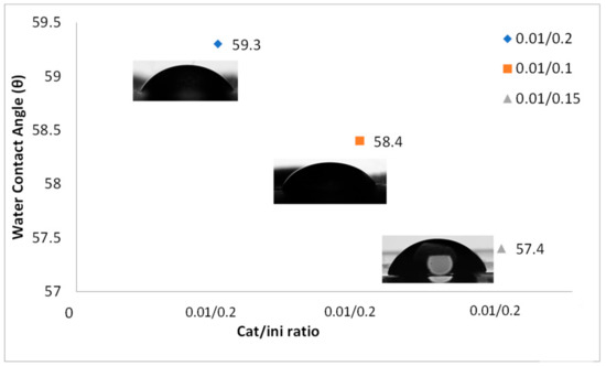 The change in the cat/ini ratio does not have a strong influence in the contact angle (Figure 8), however as the cat/ini rate increases, the contact angle decreases. But this decrement is very slight; the change is about 1°. As analyzed previously by Xiao et al. [47] for the polymerization of 2-ethoxy-2-oxo-1,3,2-dioxaphospholane initiated by Sn(Oct)2, further increase of Sn(Oct)2 or dodecanol does not provide any more active species. That is why we cannot see a drastic change in the contact angle when we use those cat/ini rates.