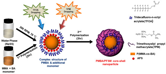 In the previously synthesized P(MMA-co-BA) nanoparticles, we synthesized P(MMA-co-BA) PFSM core-shell nanoparticles by mixing or sequentially injecting TPM and TFOA into the reactor. Here, the TPM (1.35 g, 5.4 mmol), TFOA (2 g, 4.8 mmol), and mixed monomer (TPM + TFOA [3.35 g]) were slowly added into the reactor at a rate of 1.56, 0.705, and 1.133 mL/h for 2 h, respectively. Then, the resultant mixture was stirred for 3 h at 300 rpm.