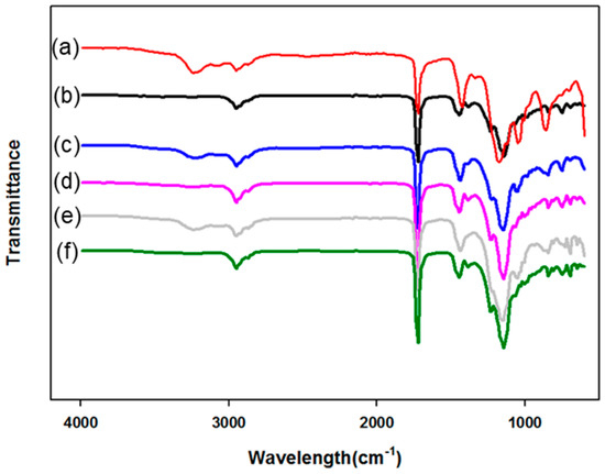 FT-IR spectra of the PMBA/PFSM core/shell nanoparticles by the change of input order and ratio of shell materials: (a) TCR-1, (b) TCR-2, (c) TCR-3, (d) TCR-4, (e) TCR-5, (f) TCR-6.