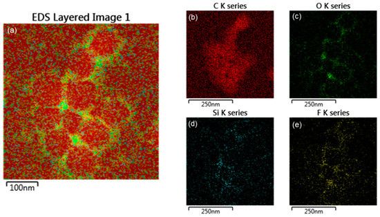 EDAX elemental mapping images of the TCR-1 sample. (a) EDS layered image, (b) C series, (c) O series, (d) Si series, and (e) F series (blue represents the C component, yellow represents the O component, red represents the Si component, and purple represents the F component in the mapping images).