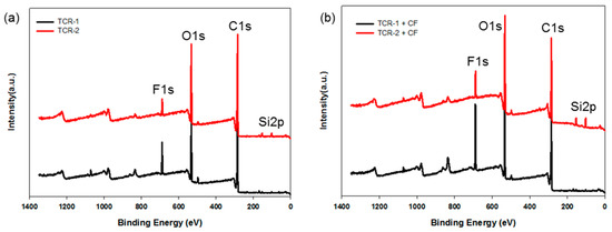 XPS survey spectra of the (a) TCR-1, TCR-2, (b) TCR + CF nanocomposites (TCR-1 + CF, TCR-2 + CF).