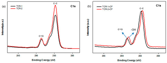 Next, Figure 10 shows the fitted peaks in the region of the carbon BE of the TCR and TCR + CF nanocomposite sample. The C1s spectrum revealed the presence of two different types of carbon atoms (functional groups). Considering that the peak located at 285.0 eV represents aliphatic C–C/C–H, the other peak appearing at about 288.0 eV can be linked to carbon atoms belonging to –C=O-based functional groups (Figure 10a). Moreover, in Figure 10b, the peak at about 288.0 eV shifted to the right because the hydrolysis of the PBMA/PFSM nanoparticles resulted in the formation of –OH functional groups in the TCR + CF nanocomposite sample.
