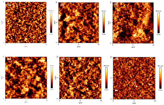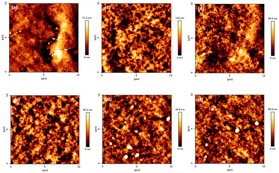 AFM height images of the TCR series + CF nanocomposite samples: (a) TCR-1 + CF, (b) TCR-2 + CF, (c) TCR-3 + CF, (d) TCR-4 + CF, (e) TCR-5 + CF, and (f) TCR-6 + CF.