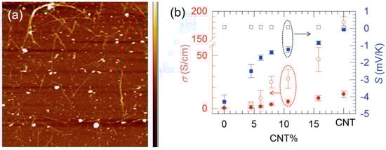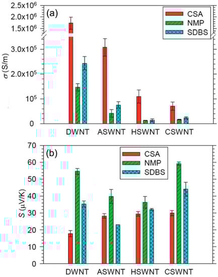 As shown in Figure 2, based on the ambient environment, all the CNTs showed positive Seebeck coefficients in the range of 20–60 μV/K, which can be explained by hole transport in the valence band [72]. This means that all of the nanotubes were doped by oxygen and showed p-type properties. The electrical conductivities were in the order of CSA > SDBS > NMP, while the Seebeck coefficient was in the order of CSA < SDBS < NMP. The results could be well explained with Equation (3). High doping levels moved into the conduction band and led to the number of electronic states above and below being more equivalent, subsequently resulting in an increased and reduced . The polarity of the three solvents should be in the order of CSA > SDBS > NMP. In NMP, the doping level of CNTs was the lowest, thus the CNTs had the highest and lowest among these three solutions. In the solution of SDBS, the doping level of CNTs was higher than that in NMP since there were more hydrogen ions from water. In CSA, the intercalation of hydrogen ions between the nanotubes and oxidation of CNTs by CSA further increased the doping level, thus increasing the and reducing the [73].