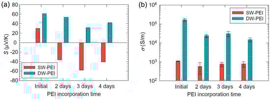 Seebeck coefficient (a) and electrical conductivity (b) of the SWCNT (SW) and DWCNT (DW) films before and after PEI incorporation for two, three, and four days. PEI can convert SWCNT rather than DWCNT from p-type to n-type. Reproduced with permission from Ref. [75]. Copyright © Elsevier, 2011.