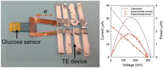 CNTs have good mechanical properties that make them suitable for use in TE devices. Yu et al. reported that CNTs-based leg structure modules can produce ~6 mV TE voltage with three p‒n couples and generate ~25 nW power upon the application of a temperature gradient of ~22 K [84]. P-type modules were made of CNT films with SDBS as a dispersant and n-type modules were made of CNT films with PEI as a dispersant and dopant. The Seebeck coefficients of p-type and n-type CNTs were measured as 81 and −80 μV/K, respectively. Further work with salable p‒n couple modules may enhance the power output of this sample construction method. The application of the TE device was studied by the sample group. A glucose sensor was made with a TE device as the power source, as shown in Figure 6. The TE device contains 72 p-type and 72 n-type CNT modules that can produce 150 mV at a temperature gradient of 32 K. The power output was 1.8 μW, which is practically viable for operating sensor units equipped with wireless communication and power management circuits.