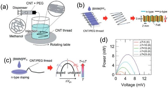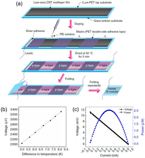 Compact-design, flexible TE modules were reported in 2017 by Zhou et al. [86], showing good stability for over three months (the variations in electrical conductivity and Seebeck coefficient were less than 5%) in air without encapsulation. The modules were fabricated on continuous CNT networks as shown in Figure 7. PEI solution was drop-casted into several CNT ribbons. The effect of the concentration of PEI solution on the TE performance of CNTs was investigated systematically. When the PEI concentration is 1 wt %, the optimized n-type films show an ultrahigh power factor of ~1500 μW/m K2. This method simplified the module preparation process, which indicates that the roll-to-roll technique can be used for large, scalable CNT-based modules. Additionally, Mitsuhiro et al. [87] proposed the direct injection pyrolytic synthesis (DIPS) method with the reinforcing agent of PEG to prepare a p-type CNT/PEG thread, as shown in Figure 8 [88]. The Seebeck coefficient of the p-type CNT/PEG thread is 47.8 μV/K, which is slightly lower than mentioned above. Furthermore, the n-type dopant 1-butyl-3-methylimidazolium hexafluorophosphate ([BMIM]PF6) can be used to obtain n-type CNT/PEG thread with a Seebeck coefficient stable at −49.1 μV/K. Finally, a novel prototype TE fabric is fabricated by using single CNT/PEG thread, p/n-striped doping, and easy fabrication processes of π-type cells. The output performance of the prototype TE fabric is investigated. This novel method can not only fabricate wearable flexible p/n-type TE devices by a single CNT-based thread, but also reduce the interface contact resistance to effectively improve the output performance.