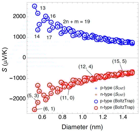 Seebeck coefficient of semiconducting CNTs within the diameter range 0.5–1.5 nm. The temperature is constant at 300 K. Reproduced with permission from Ref. [93]. Copyright © American Physical Society, 2015.