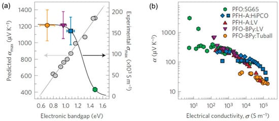 (a) Dependence of the theoretically predicted peak Seebeck coefficient (grey symbols and grey line) and maximum experimentally measured electrical conductivity (colored symbols and black line) on the semiconducting CNT electronic bandgap. The vertical error bars are derived from the standard deviation of the measured sheet resistances and film thicknesses. The horizontal error bars denote the standard deviation of the electronic bandgap derived from the semiconducting CNT diameter distribution. (b) Experimentally measured Seebeck coefficient as a function of electrical conductivity Reproduced with permission from Ref. [101]. Copyright © Springer Nature, 2016.