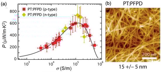 Significant progress has been achieved in the TE field in recent decades. State-of-the-art inorganic materials have high ZT values over 2 [16,17,18,19]. However, these inorganic materials typically are expensive, heavy, brittle and contain toxic elements such as Bi and Sb [20,21,22]. A lot of researchers have turned to organic materials for low-cost, high-performance TE materials because organic materials, especially polymers, are normally cheap, low-weight, flexible and non-toxic [23,24,25,26]. In addition, solution processing and printing techniques can be used to make the manufacture of organic TE modules much easier compared to inorganic TE materials [27,28,29,30,31]. In this regard, organic TE materials have the potential to bring about significant improvement even if their conversion efficiency is comparable to, or less than, that of the state-of-the-art inorganic materials [32,33,34]. Most of the power generation by TE materials is still suitable for organic materials, although the working temperature of organic TE materials may be lower than that of inorganic TE materials due to the decomposition of organic materials at high temperature [35,36]. For example, a major part of waste heat lost from fossil fuels is released under 150 °C, as reported by Shindo et al. [37].