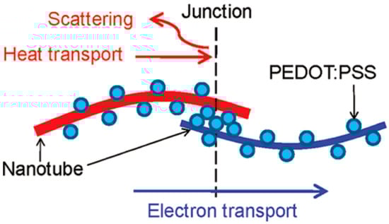 With the idea of integrating the bilateral advantages of each component, CNT‒polymer composites have been proposed [110,111,112]. Table 3 summarizes the TE properties reported for CNT‒polymer composite samples. In the beginning, polymer is used as a poor thermal conductor in the composites since the intrinsic thermal conductivity of the polymers is low [113]. A segregated network CNT‒polymer structure with an electrical conductivity of 4800 S/m, thermal conductivity of 0.34 W/m K, and ZT value of 0.006 at room temperature has been reported [114]. Since then, with the fast development of conducting polymers, poly(3,4-ethylenedioxythiophene): poly(styrenesulfonate) (PEDOT:PSS) has become one of the most widely used polymers [115]. A well-known junction structure has been proposed as shown in Figure 12, which is believed to give rise to exceptional TE transport properties. Specifically, a series of connected electron channels formed at the interfaces. Because of the excellent electronic transmission properties of CNT, the electrical conductivity of the composite film increased significantly to ~40,000 S/m. In addition, due to the mismatch of the molecular vibrational spectra between CNT and PEDOT:PSS, the propagation of phonons at the nodes is impeded, thus preventing the increase of thermal conductivity and the decrease of the Seebeck coefficient. Finally, the optimized ZT value reached 0.02 at room temperature [116]. Furthermore, the TE performance is found to increase with the increase in the CNT ratio. When the concentration of CNTs reaches 60 wt % in the CNT‒polymer composite, an electrical conductivity of 1.3 × 105 S/m is obtained with a Seebeck coefficient value of 41 μV/K [117]. The out-of-plane thermal conductivity is measured to be 0.2–0.4 W/m K. However, the ZT value is not provided in the paper since the electrical properties are all in the in-plane direction. It should be mentioned that morphological factors such as the distribution of the CNT in the polymer matrix and the roughness of the surface of the composites, also play an important role in determining the ultimate TE power factor.
