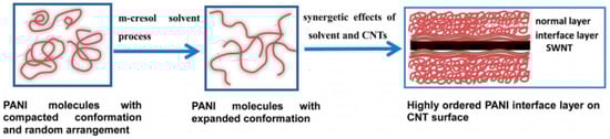 Schematic representation of the formation of an ordered PANI interface layer induced by the synergistic effects of the solvent process and the π‒π interactions conjugation between CNTs and PANI. Reproduced with permission from Ref. [119]. Copyright © Royal Society of Chemistry, 2014.