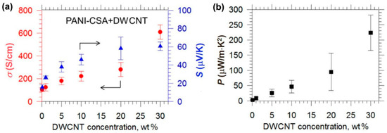 Simultaneous enhancement of electrical conductivity and Seebeck coefficient has been observed in the CNT‒polymer composites, which is unusual and does not follow the Wiedemann‒Franz law [120]. Typically, an increase in electrical conductivity accompanies a decrease in the Seebeck coefficient, and vice versa. Hong et al. reported that the electrical conductivity and Seebeck coefficient can be simultaneously increased [121]. As shown in Figure 14, the CNT‒PANI composite has a high electrical conductivity of 61,000 S/m and a high Seebeck coefficient of 61 μV/K, leading to a high power factor of 220 μW/m K2, which is the highest among previously reported PANI-based TE materials. The main reason for the simultaneously enhancement of electrical conductivity and Seebeck coefficient is due to the improvement of carrier mobility that raises the electrical conductivity and the reduction of carrier concentration that enlarges the Seebeck coefficient. The improvement in carrier mobility is attributed to the band alignment, which attracts hole carriers to CNTs whose mobility is much higher than that of the polymer. In addition, the energy barrier at the interface of CNT and PANI may play an important role [122,123,124,125,126]. Theoretical study suggests that the power factor can be remarkably improved by imposing an energy barrier at the interface of conjugated carbon structures [118,127,128].