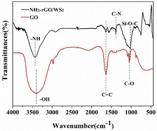 The FT-IR spectra of GO and NH2-rGO/WS2 are shown in Figure 1. In the spectrum of GO, the adsorption band at 3423 cm−1 is assigned to –OH, indicating that GO has been oxidized. The typical bands at 1643 and 1040 cm−1 are ascribed to C=C and C–O vibrations, respectively. By contrast, –OH and C–O vibrations at 3423 and 1040 cm−1 disappear in the spectrum of NH2-rGO/WS2, while the peak of C=C still exists, proving the reduction of GO. In addition, the adsorptions at 3450, 1380, and 1080 cm−1 are attributed to –NH2, C–N, and Si–O–C, suggesting that APS has been successfully grafted to the surface of rGO/WS2.