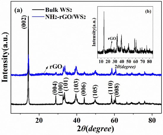 The crystallographic phases of bulk WS2 and NH2-rGO/WS2 was investigated by XRD spectra, which is shown in Figure 2. The XRD spectrum of bulk WS2 demonstrates highly crystalline hexagonal structure without any impurities. The strong (002) peak located at 2θ = 14.3° corresponded to a d-spacing of 0.62 nm, according to the Bragg equation, indicating a well-stacked layered structure along the c axis []. The XRD pattern of the bulk WS2 shows sharper and more intense peaks as compared to NH2-rGO/WS2 nanoparticles, indicating both smaller lattice size and fewer layers of NH2-rGO/WS2 along the c axis. In the magnification spectrum of XRD, all the diffraction peaks of NH2-rGO/WS2 can be observed, as well as a new diffraction peak of rGO at 2θ ≈ 24.0°, confirming the triumphant synthesis of NH2-rGO/WS2. The existence of rGO enables further decrease of WS2 layers in NH2-rGO/WS2.