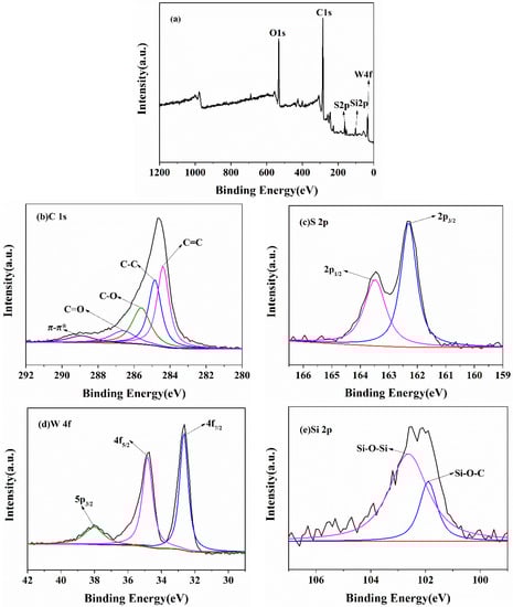 XPS spectra of (a) NH2-rGO/WS2, (b) C 1s, (c) S 2p, (d) W 4f and (e) Si 2p of NH2-rGO/WS2.