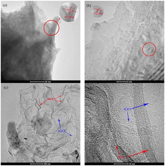 To better verify the microstructures of WS2 and NH2-rGO/WS2, TEM and HRTEM studies were carried out. As is shown in Figure 4a,b, WS2 demonstrates a well-layered structure with d(002) = 0.62 nm and periodic arrays of (100) planes with a W-S lattice spacing of 0.27 nm, which coincides with the result of XRD analysis and the hexagonal lattice of the WS2 phase. It is labeled in Figure 4c that WS2 has been anchored on GO nanosheets homogeneously, indicating the successful combination of WS2 and GO nanosheets. The HRTEM image in Figure 4d explicitly exhibits that WS2 and GO nanosheets appear alternatively, forming a multilayered hybrid structure.