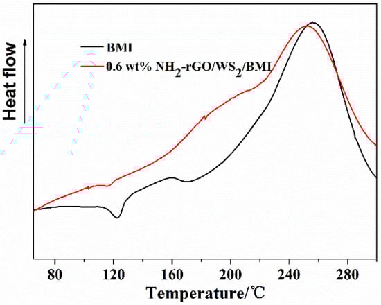 The curing behavior of a thermosetting system determines the structure, as well as the properties, of the cured resin. Figure 7 gives the DSC curves of the neat BMI resin and 0.6 wt % NH2-rGO/WS2/BMI composite. The neat BMI resin presents a sharp and strong exothermic peak at 257.4 °C, due to homopolymerization of BMI. By contrast, the exothermic peak of 0.6 wt % NH2-rGO/WS2/BMI composite shifts to the left with a peak temperature around 252.5 °C, and becomes broader. This is because that the amino groups on the edges of NH2-rGO/WS2 particles can react with imide rings through the Michael reaction []. The detailed reaction mechanism is shown in Scheme 2. It is notable that NH2-rGO/WS2/BMI resin shows better processability, since the whole exothermic peak of NH2-rGO/WS2/BMI composite appears at a lower temperature than that of the neat BMI resin.