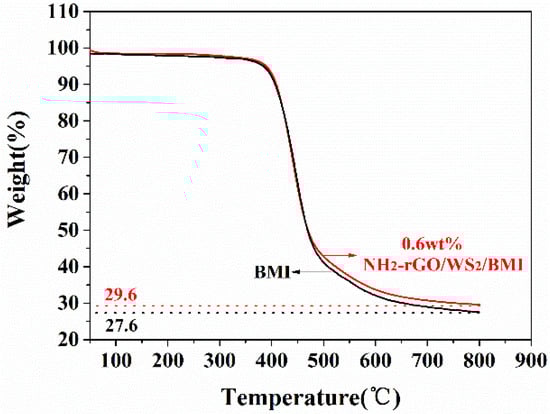 Figure 8 shows the overlay curves of weight loss of the cured neat BMI resin and BMI composite with 0.6 wt % of NH2-rGO/WS2 nanoparticles. As expected, BMI composite with 0.6 wt % of NH2-rGO/WS2 nanoparticles exhibit slightly higher decomposition temperature and a better thermal stability than the neat BMI resin. The char yield of the neat BMI resin at 800 °C is 27.6%. It is exciting that the addition of 0.6 wt % of NH2-rGO/WS2 nanoparticles efficiently raises the char yield of the BMI composite at 800 °C to 29.6%, with an increase of 7.25%. The result indicates that NH2-rGO/WS2 fillers can improve the thermal property of the neat BMI resin. This can be explained by the barrier effect of modified GO nanosheets, uniform dispersion of NH2-rGO/WS2 fillers, and strong interfacial bonding between NH2-rGO/WS2 nanoparticles and BMI matrix [].