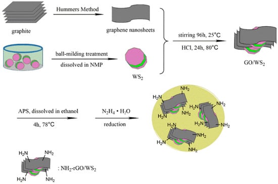 The experimental procedures can be concluded as two steps: (1) the reaction to graft APS on the surface of GO/WS2, and (2) the reducing reaction to obtain NH2-rGO/WS2 using hydrazine hydrate, and the reduction of GO is aimed at promoting the intercalation with WS2 to prevent the agglomeration of nanoparticles.