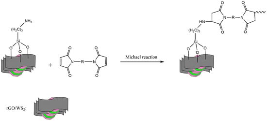 The mechanism of Michael reaction of the amino groups on the NH2-rGO/WS2 particles to maleimide groups.