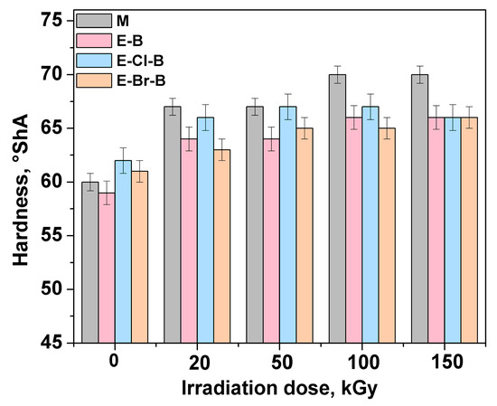 - Majumder, P.S.; Bhowmick, A.K. Surface and bulk-properties of EPDM rubber modified by electron beam irradiation. Radiat. Phys. Chem. 1998, 53, 63–78. [Google Scholar] [CrossRef]