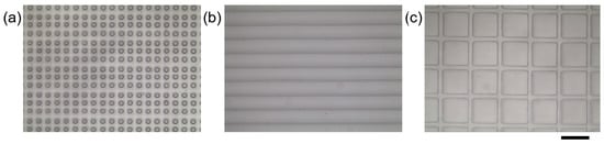 Morphologies of fabricated microstructured surfaces based on the etched template. (a) The microstructured surface with raised dot. (b) The microstructured surface with raised line. (c) The microstructured surface with raised square. Scale bar: 200 μm.