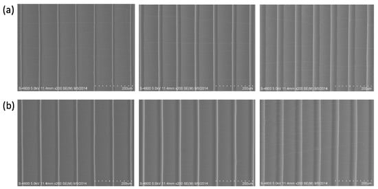 Morphologies of etched line templates and the microstructured surface with raised line based on multilayer inkjet-printed microtemplates. (a) The etched templates with different inkjet printing layers (1, 3, 5 layers from left to right). (b) The replicated microstructures with different inkjet printing layers (1, 3, 5 layers from left to right).