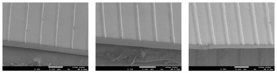 Morphologies of fabricated line microstructured surfaces of polyvinyl alcohol (PVA) based on etched line templates with different inkjet printing layers (1, 3, 5 layers from left to right).