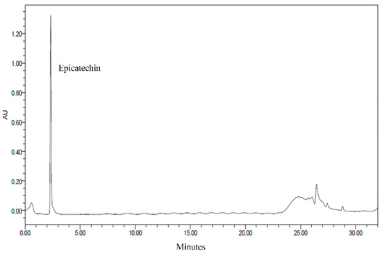 CNE contains a considerable amount of epicatechin, which has strong antioxidant activity [11,21]. Epicatechin is a major component of the CNE prepared in this study (Figure 1). Thus, the antioxidant capacity of CNE is mainly due to epicatechin. Similarly, Schinella et al. [10] reported the high antioxidant activity of CNE with epicatechin as the major component, assessed using HPLC.