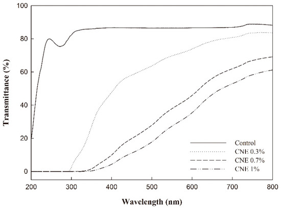 Figure 2 shows the UV-visible transmittance of the ABS films, where differences between the control (ABS film without CNE) and ABS films containing CNE were observed. In particular, the control film had high transmittance, whereas the ABS films containing CNE had relatively low transmittance (200 to 800 nm). Thus, the incorporation of CNE caused high absorption below 400 nm, corresponding to UV light, which could cause lipid oxidation in foods. In particular, the ABS films with 1% CNE prevented almost all UV transmission, indicating that the films could protect packaged foods against UV light [1]. Moreover, in the visible light range of 400 to 800 nm, the ABS films containing CNE had lower transmittance than that of the control film. Therefore, the ABS films containing CNE could be utilized as effective UV-shielding films. Similar results have been reported in starch films containing natural extracts [25,26].