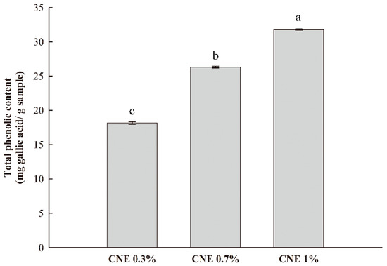 The TPC of the ABS films containing CNE was determined (Figure 3). As expected, the TPC increased as the amount of CNE increased. In particular, the TPC of the ABS film with 1% CNE was 31.78 mg gallic acid/g film, which is relatively higher than previously reported values [29]. According to a report by Shojaee-Aliabadi et al. [30], the TPC of k-carrageenan films with 3% Satureja hortensis essential oil was 20.56 mg gallic acid/g film. In general, the TPC is related to antioxidant activity. Effective free radical scavenging capacity of natural extracts is mainly derived from phenolic constituents in their composition. Therefore, the antioxidant activity of the ABS films containing CNE is closely related with the TPC of the films.