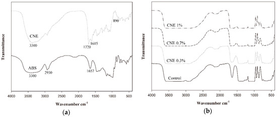 An FT-IR spectrophotometer (VERTEX 80v, Bruker Optics, Billerica, MA, USA) was used to obtain the ATR-FTIR spectra of ABS films containing CNE in the wavenumber range of 4000 to 400 cm−1.