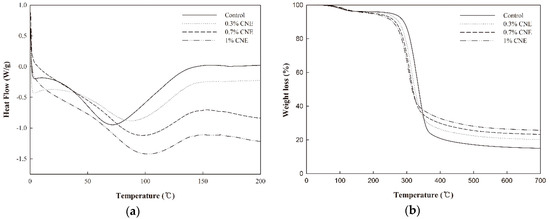 DSC and TGA were conducted using a differential scanning calorimeter (DSC1; Mettler Toledo, Columbus, OH, USA) at a rate of 10 °C/min. Each sample was scanned from 0 to 200 °C for DSC and heated from 25 to 700 °C for TGA.