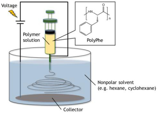 The synthesized PolyPhe was dissolved in TFA/CHCl3 (9/1 v/v) at a concentration of 32 w/v%. The solution was then electrospun in the air, but no fiber formation was observed (Figure S1), possibly because of low polymer concentration and low solution viscosity. Thus, as an alternative approach, we focused on a novel electrospinning technique in the nonpolar solvents developed by Wakisaka and Tsuchiya [29,30]. Different from conventional electrospinning in the air and wet electrospinning (spinning in the air and fiber collection in the bath) [31,32,33], all processes including spinning with this method are done in a non-polar, electrically insulating solvent (such as hexane, cyclohexane, etc.). They also mentioned that using this technique the instability of Taylor cone often observed during electrospinning in the air can be efficiently suppressed, and that electrospinnability can be tuned by the surrounding conditions [30]. In addition, because a nonpolar solvent used in the bath for fiber collection is indeed a poor solvent for the polymer, polymer precipitation should occur throughout solvent exchange, which may induce crystallization of the polymer. Furthermore, fiber formation in a nonpolar solvent is likely to effectively accumulate benzene rings on the surface of the forming fibers for enhancing surface hydrophobicity of the resultant nonwovens.