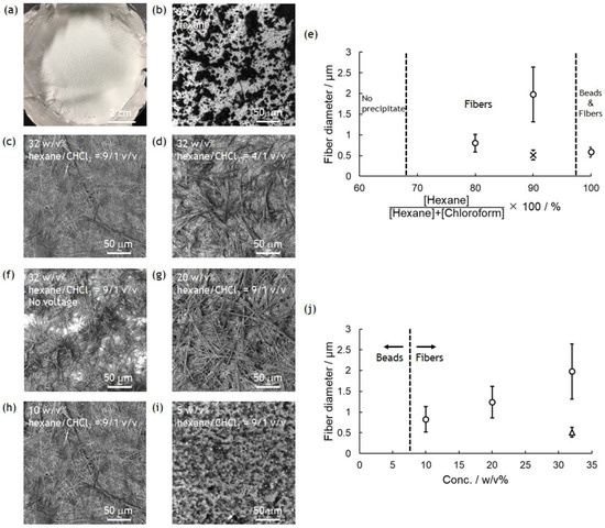 Electrospinning of PolyPhe in TFA/CHCl3 (9/1 v/v) into hexane/CHCl3 (10/0, 9/1, 4/1 v/v). PolyPhe conc. was 32, 20, 10, or 5 w/v%. (a) A typical photograph of PolyPhe nonwovens collected on the aluminum foil. (b–d,f–i) LM images of the electrospun PolyPhe constructs. The voltage was (b–d,g–i) 5 kV and (f) 0 kV, solution speed was 0.5 mL/h, and collection distance was 3 cm. (e) Solvent composition vs fiber diameter. PolyPhe conc. was fixed at 32 w/v%. (j) PolyPhe conc. vs fiber diameter. The solvent was hexane/CHCl3 (9/1). The diameter was calculated from SEM images of three different samples (n = 50). A cross in (e) is the value calculated from the image (f). A triangle in (j) is the value calculated from the cast film.