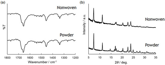 (a) FT-IR spectra and (b) XRD patterns of as-synthesized and nonwoven PolyPhe prepared by electrospinning of 32 w/v% solution.