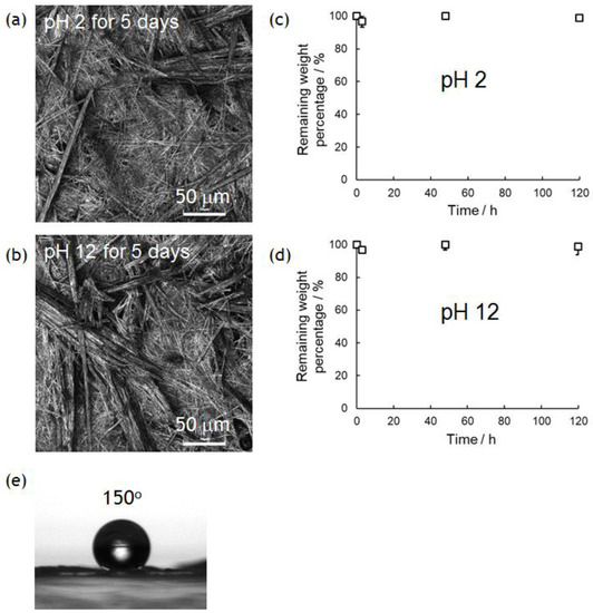 In previous research, we demonstrated the hydrolytic property of superhydrophobic materials composed of only amino acids [10]. This would be quite important in developing truly biomimetic/bioinspired materials for biomedical and green/environmental applications, because conventional superhydrophobic materials containing non-degradable parts (typically fluorinated compounds) are difficult to hydrolyze in similar conditions. PolyPhe with rigid main chains used in this study is expected to be much tougher than previous polymers with flexible main chains. Thus, the nonwovens prepared by electrospinning should show better chemical stability in both acidic and basic solutions. Approximately 3 mg of the PolyPhe nonwovens prepared by electrospinning into hexane/CHCl3 (9/1 v/v) were forcibly immersed in 0.01 M HCl aq. (pH 2) or 0.01 M NaOH aq. solution (pH 12) at ambient temperature. Interestingly, the weight of the nonwovens was not changed at all in both conditions even after 5 days (Figure 5a,b) and the morphologies of the nonwoven surfaces were almost the same as those before the treatments (Figure 5c,d). FT-IR spectra indicated no significant damage by the treatments (Figure S8). Similar hydrolytic experiments in 5 M HCl aq. at 80 °C for 24 h and 5 M NaOH aq. at 80 °C for 24 h were done in the same manner, but no weight change was observed. Enzymatic degradation was also tried with pepsin, which efficiently cleaves peptide bonds between aromatic amino acids [42], but no change occurred. Furthermore, the superhydrophobic property was also re-tested with the nonwovens after 5 days’ immersion in a 0.01 M NaOH aq. at ambient temperature. Surprisingly, the water CA on the nonwovens was still over 150° (Figure 5e). Such results are enough to demonstrate chemical stability of the PolyPhe nonwovens.