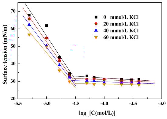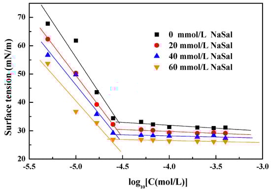 | Salt (mmol/L) | CMC (µmol/L) | (mN/m) | (kJ/mol) | Salt (mmol/L) | CMC (µmol/L) | (mN/m) | (kJ/mol) |