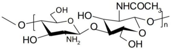 Chitosan is a polymer obtained by alkaline or enzymatic deacetylation of chitin, which is the main component in the exoskeleton of marine organisms such as crab, lobster, squid, shrimp, insect cuticle, the cell wall of some fungi and other organisms such as algae or yeasts. [10]. Chemically, chitosan consists of repeating units of N-acetyl-d-glucosamine and d-glucosamine linked by β-(1-4) glycosidic bonds (Figure 1) [11].