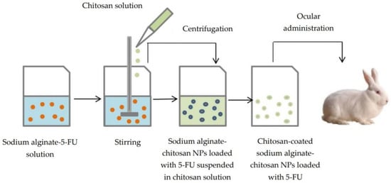 Due to the viscosity-enhancing effect, chitosan solutions enable the ocular retention of nanoparticles [36]. Chitosan-coated sodium alginate-chitosan nanoparticles with 5-fluorouracil (5-FU) were prepared by the ionic gelation technique and then suspended in chitosan solution, which is responsible for the enhanced viscosity, as nanoparticles did not show any interaction with mucin. In vivo study on rabbit eye showed a higher level of 5-FU in aqueous humor compared to 5-FU solution (Figure 2). The alginate shell was obtained by cross-linking with chitosan, which took place spontaneously through electrostatic interactions between negatively-charged carboxyl groups of alginate and protonated amino groups of chitosan [37].