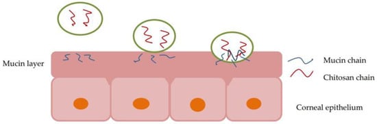 The mucinous layer keeps the film on the eye surface and creates an unfavorable environment for the growth of pathogens. Other important roles are to maintain the ocular surface moisturized, an optimal refractive index at the air-water-cornea interface and to keep solubilized proteins in tears [39]. Mucin is negatively charged at physiological pH (7.4) due to sialic acid residues from the terminal ends of the mucopolysaccharide chain, resulting in a preferential intake for cationic molecules. The use of positively-charged formulations is the most common way to increase the bioavailability of ocular formulations [7]. Chitosan has an attractive potential in improving the permeability through the mucosal epithelium due to its cationic structure and mucoadhesive character [40]. At low pH, the amino groups are protonated, and the polymeric macromolecules become positively charged. The cationic structure determines electrostatic interactions with the negatively-charged groups of sialic acid from epithelial surfaces (Figure 3). The mucoadhesive character is also influenced by hydrogen bonds and hydrophobic interactions [6].