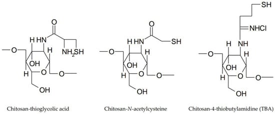Substitution of the primary amino groups from the chitosan structure with thiol groups generates thiolated derivatives [45]. Three thiolated derivatives: chitosan conjugates with thioglycolic acid, chitosan-cysteine conjugates and chitosan-4-thiobutylamidine (TBA) conjugates were synthesized (Figure 4). The mucoadhesive properties of the thiolated derivatives are due to covalent bonds between the thiol groups of the polymer and the cysteine of the mucosal layer. Chitosan-thioglycolic acid conjugates have a 5–10-fold higher mucoadhesiveness compared to unmodified chitosan. In the case of chitosan-TBA conjugates, they have enhanced mucoadhesive properties due to ionic interactions between the additional amidine structure and the anionic mucosal layer. Studies have shown that average molecular weight conjugates have the highest mucoadhesive character [46].