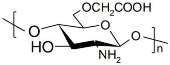 Carboxymethylation of chitosan generates soluble derivatives in both acidic and alkaline medium. These derivatives exhibit high viscosity, low toxicity, superior mucoadhesive properties and the ability to form gels [49]. Carboxymethyl chitosan is obtained by carboxymethylation of hydroxyl groups of chitosan. Reactive groups such as the carboxyl or amino group remain available for chemical modification in order to improve physical properties (Figure 5) [50].