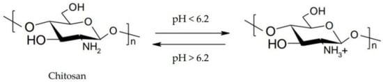 Chitosan is a pH-responsive polymer, which remains in aqueous solution up to 6.2 [59]. It has pH-sensitive properties due to the protonation-deprotonation balance of amino groups, which allows the formulation of controlled release systems (Figure 6) [60].