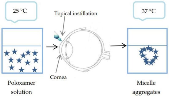 Poloxamers are thermosensitive polymers available in Europe under the name Lutrol® and in the US. under the name Pluronics®. The most commonly used are Poloxamer 407 and Poloxamer 188 [66]. These are block copolymers made up of polyoxyethylene units and polyoxypropylene units that undergo a sol-gel transition when temperature rises. The gelation mechanism involves the formation of micelle aggregates dependent on temperature or polymer concentration (Figure 7) [67]. These spherical micelles have a dehydrated polyoxypropylene core and hydrated polyoxyethylene outer shell. Temperature rise causes dehydration and conformational changes in the hydrophobic chains. It also increases chain friction and entanglement of the polymeric network. More unbound water is available at hydrophilic regions, and polyoxyethylene chains interpenetrate the gel structure [27]. At concentrations of 18% or more in aqueous solution, poloxamer is converted from a low viscosity solution into a non-cross-linked gel at room temperature. If the preparation was stored in the refrigerator for easy administration, the low temperature of the preparation would produce a potential ocular irritation [68].