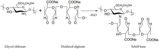 Alginate is a biocompatible and biodegradable anionic polysaccharide composed of β-d-mannuronic acid and α-l-guluronic acid residues linked by 1,4-glycosidic bonds. It increases ocular contact time due to its mucoadhesive character and gelling properties resulting from the interaction of guluronic acid residues with calcium ions in the tear fluid [65]. In order to improve mechanical properties and erosion resistance, it is associated with chitosan or its derivatives. Thus, the carboxyl groups of the alginate cause the formation of ionic bonds with the positive groups of chitosan with the appearance of a shell around the alginate gel, which becomes more resistant [79]. Gupta et al. formulated an in situ gelling system based on sodium alginate and chitosan for ocular delivery of levofloxacin, and they compared it with conventional ophthalmic drops. Chitosan turned into gel when the pH reached 7.4. Sodium alginate formed a gel upon contact with the divalent cations present in the simulated lacrimal fluid. Through a dual gelling mechanism, a gel with good stiffness and pseudoplastic behavior was obtained. Studies concluded that eye drops were rapidly removed from the corneal surface, while the in situ gel provided a prolonged retention time on the corneal surface [80]. Xu et al. developed an in situ gel based on glycol chitosan and oxidized alginate for ocular delivery of Avastin. Gelation was due to the interaction between the amino group of chitosan and the aldehyde group of alginate that results in a Schiff base (Figure 9). Glycol chitosan was used instead of chitosan because of its better solubility. By modulating the ratio between glycol chitosan and oxidized alginate, the gelation time ranged from 10 s–5 min [81].