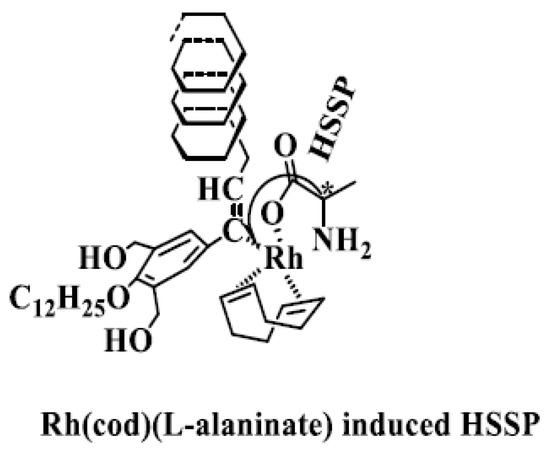 When [Rh(L-alaninate)(cod)] and [Rh(L-alaninate)(nbd)] were used as catalysts, even though the Rh-N bonds dissociate, the Rh-O bonds are preserved (Chart 1). This differences between the bonds are due to the stronger donating and acceptor abilities of the O-atom compared to the N-atom. The Rh–N bond length is greater than the Rh–O bond length, enabling proton transfer from the NH group to the coordinated monomer [17,24]. The synthesis and characterization of [Rh(L-alaninate)(cod)] and [Rh(L-alaninate)(nbd)] can confirm that the Rh complex containing the amine group may be the real active species of HSSP or SHSSP (Chart 1), providing direct evidence for our previous results [13]. Therefore, the isolated [Rh(L-alaninate)(cod)] and [Rh(L-alaninate)(nbd)] also maintains a higher helical selective ability than the binary [Rh(cod)Cl]2/L-alaninol and [Rh(nbd)Cl]2/L-alaninol catalytic system in HSSP of DoDHPA.