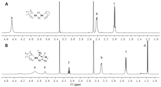 (A) 1H NMR spectra of [Rh(cod)Cl]2 and (B) [Rh(L-alaninate)(cod)] in DMSO-d6 at 25 °C.